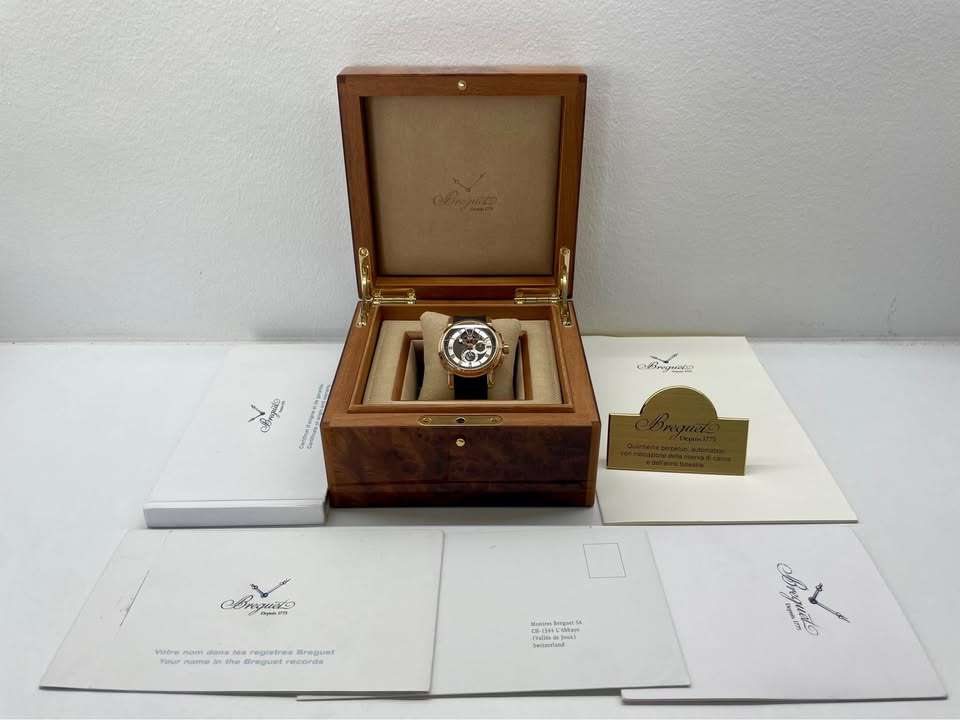 Az órához vastag, 18 kt tömör arany áthajlózár tartozik, valamint eredeti friss Breguet gyári szervizszámla és a kapcsolódó dokumentációk is rendelkezésre állnak. Egy ilyen szintű darabnál a dokumentált gyári háttér nem részletkérdés, hanem az értékmegőrzés alapja.