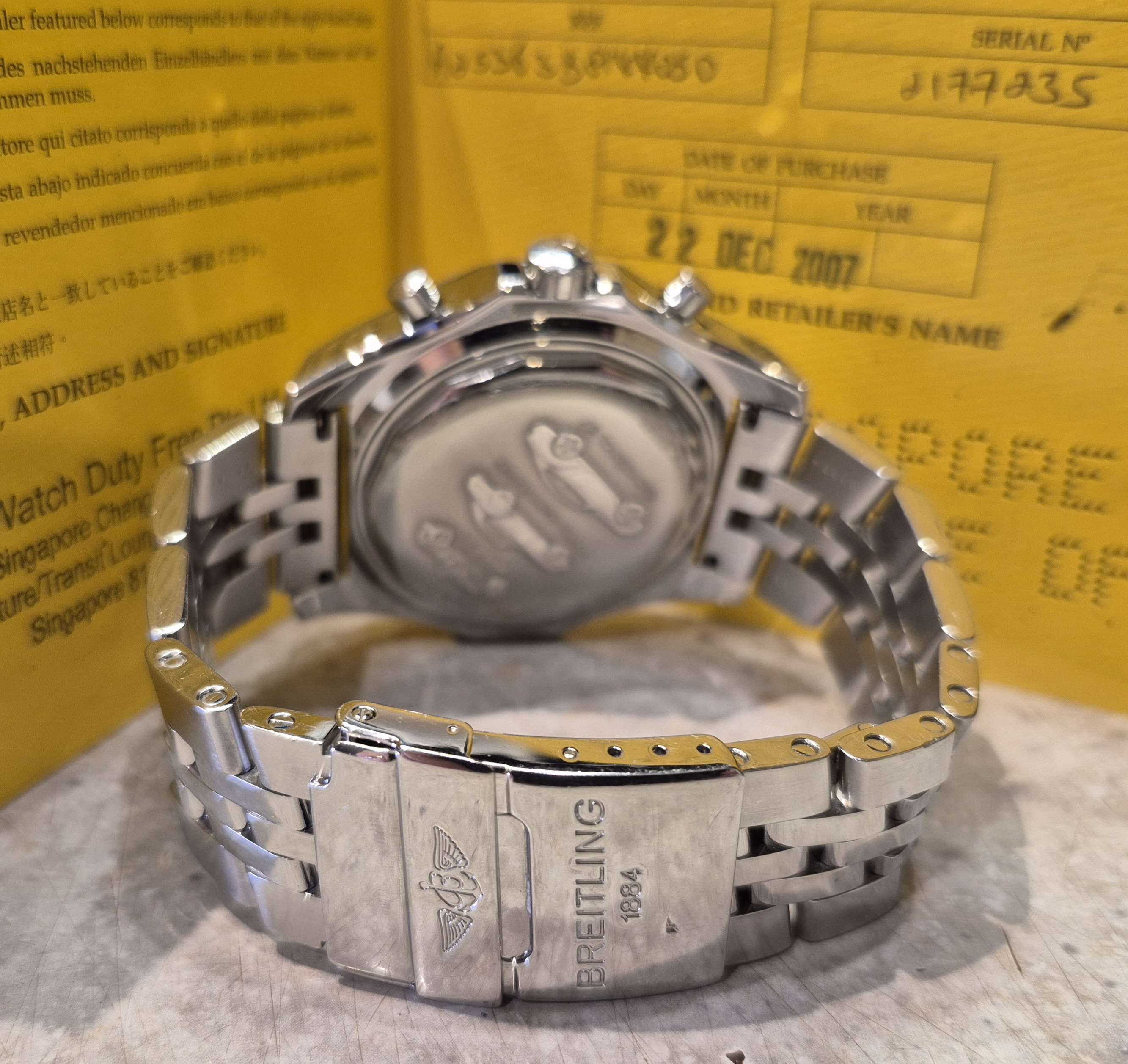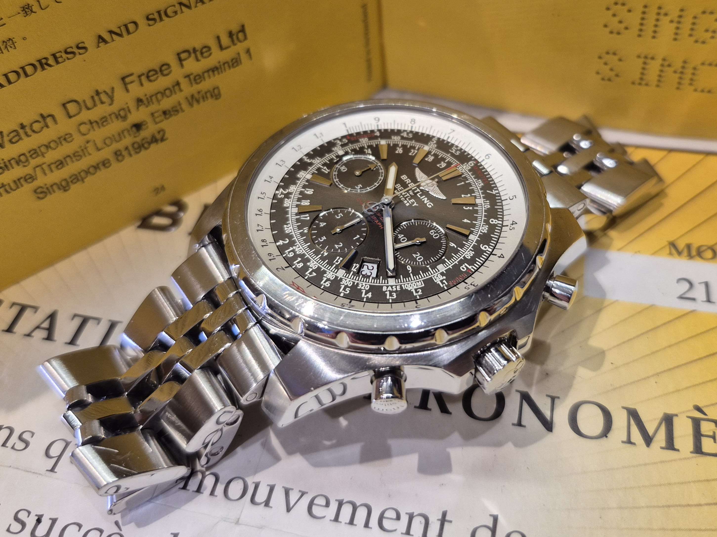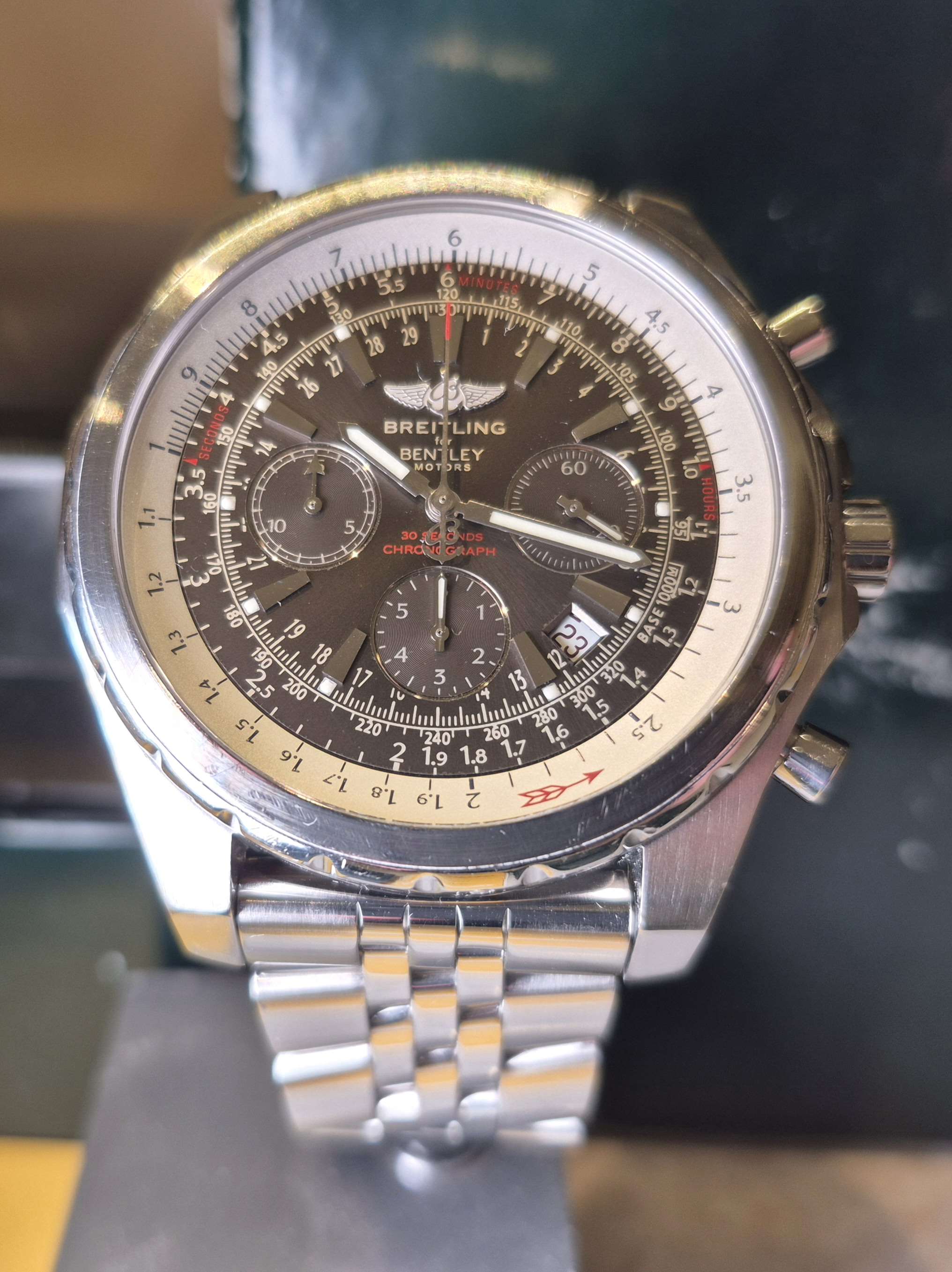 Komplett,hatalmas 49mm-es breitling bentley motors T anthracite grey számlapos,két irányba forgatható navigáció lünettás,elegáns sportóra 1500 euro feláras gyári speed fémszíjával,makulátlan műszaki és esztétikai állapotban gyári 300-es lengéssel díszdobozában,könyvével,garancia füzetével,chronometer certifikátjával,kalkulátor táblázatával full setben szuper áron eladó,cserélhető. Az óra különlegessége a 15 perces stopper számláló és a fél perc alatt körbefutó másodperc számlálója.Ref.száma:A25363.A rendkívül kedvező ár kp-s vásárlásra vonatkozik a csere ár magasabb!Kérem tekintse meg további óráimat!