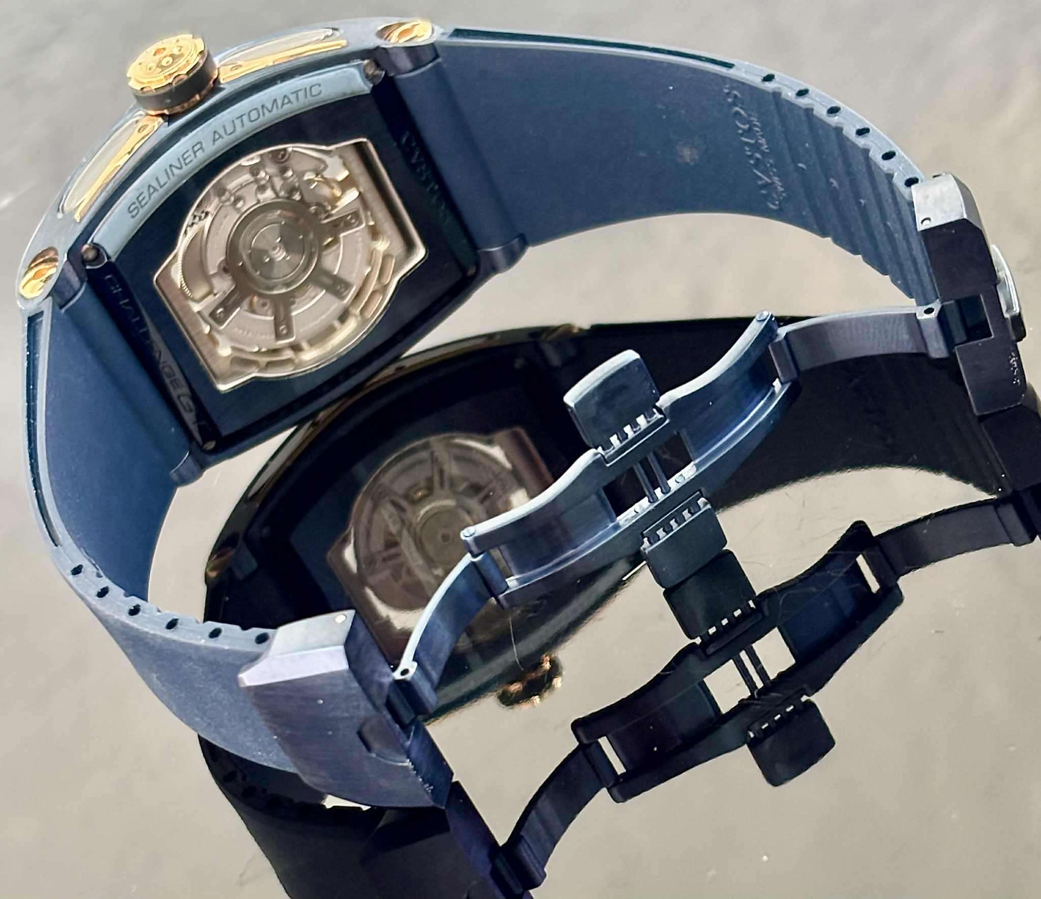 Automata szerkezet,különleges bluesteel hordó alaku tok,arany diszitésekkel és az oldalán zafirüveg berakásokkal,elöl-hátul zafirüveg,skeleton számlap tikkfa betéttel és arany indexekkel arany koronával,kék kaucsukszij pillangózárral.