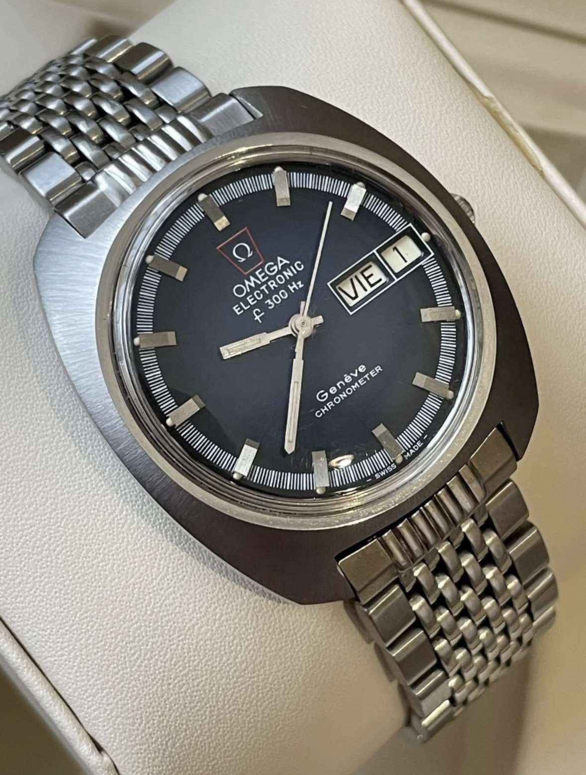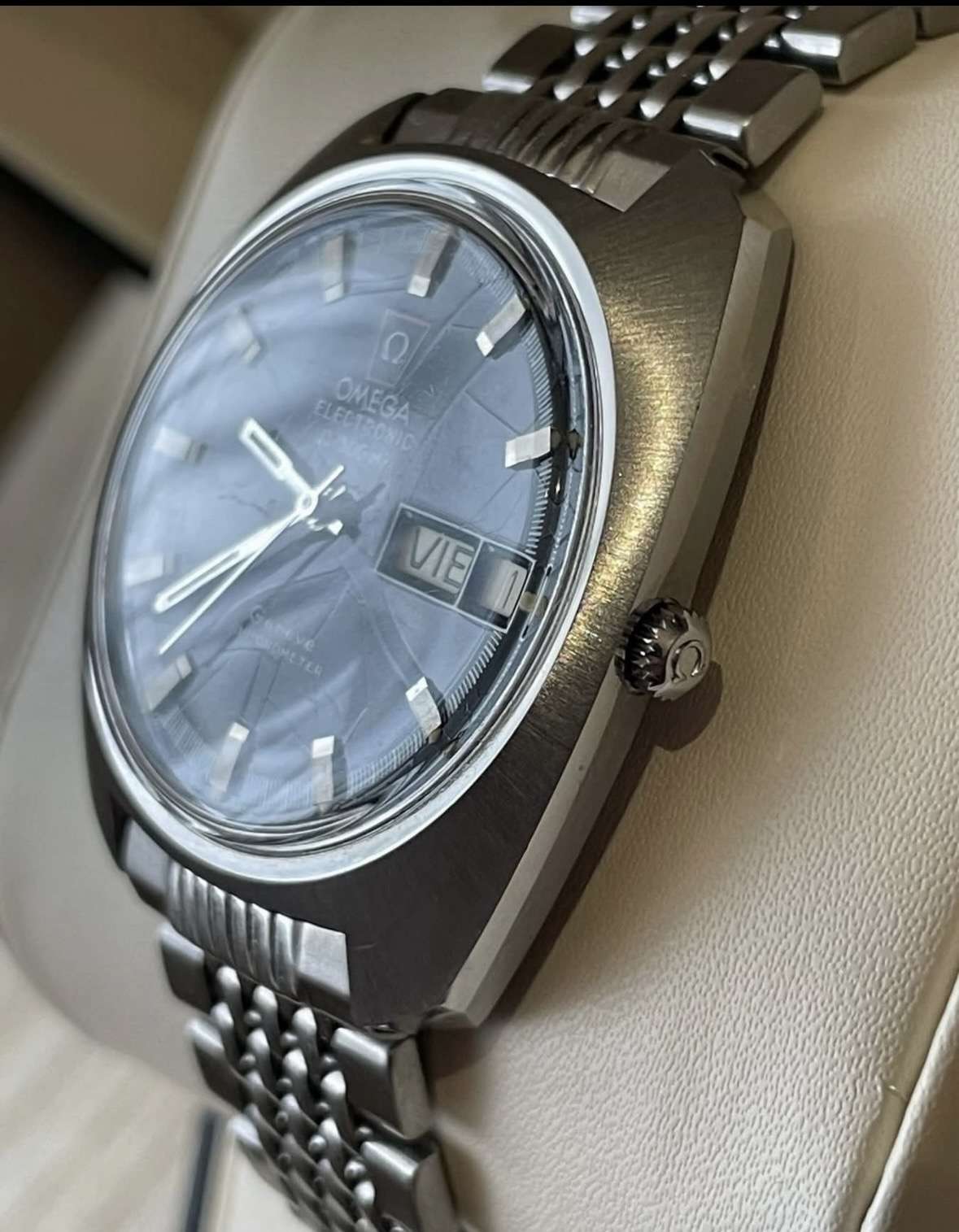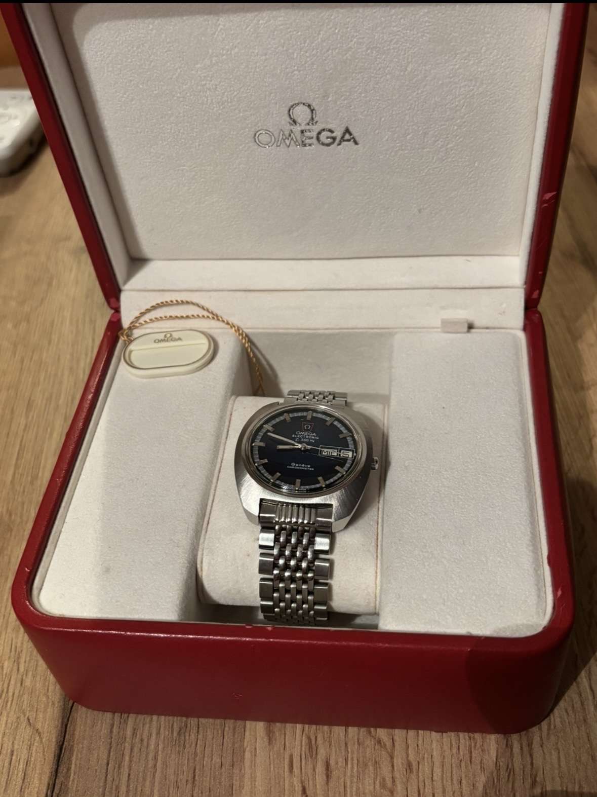 Eladó egy különleges vintage Omega Genève Electronic F300Hz, amely a legendás hangvillás technológiával készült. Az óra körülbelül 1972 körüli gyártású, és a korszak egyik ikonikus elektronikus Omega modellje.