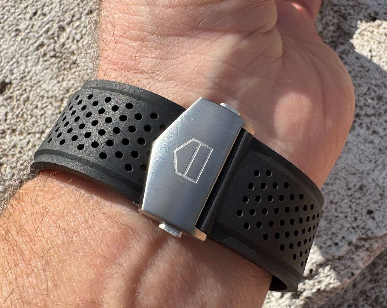Gyönyörű kék-fekete kerámia lünettás, kaucsuk szíjjas különlegesség.