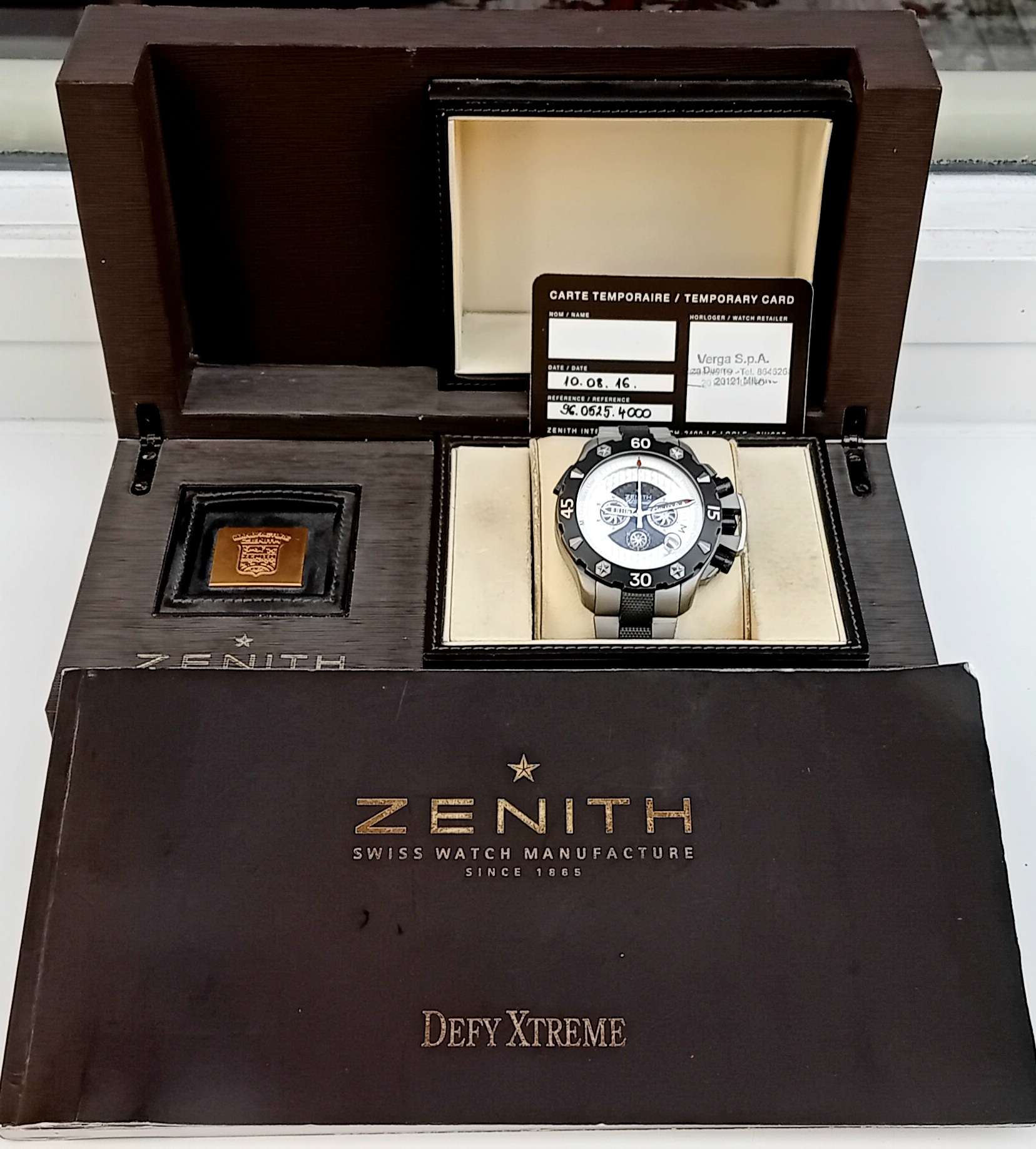 Zenith Defy xtreme chronograph titán tokos és szíjas fekete indikációkkal ellátott verzió dobozában,könyvével.gyári garanciakártyájával,aranyplakettel szuper áron eladó,cserélhető.Az óra egy remekmű,46,5mm széles,20mm magas titán tokos és titán fémszíjas csoda. Egy extrém sportokhoz tervezett 1000 méterig vízálló sport chronográf.A listaára 17000 euro volt,több,mint 2000 euróval volt drágább,mint egy audemars piguet offshore acél bőrszjas modell akkoriban.A Helvetia óra & ékszerboltban jelenleg is kapni még defy xtreme modellt 6.5 m ft-ért! Ref.száma: 96.0525.4000. A Nataf érában készült a gyár aranykorában amikor a tervezőmérnökök kezét nem fogták meg a pénzügyi szakemberek,mint a mercedesnél a w140-es bálna az örökkévalóságnak készítve. A rendkívüli igénybevételhez tervezett 36000-es lengésű így rendkívül pontos el primero módosított szerkezet hídjai,billegő hídja és a hídtartók speciális titán,alumínium núbium ütéselnyelő ötvözetből; zenithiumból készültek a golyóscsapágyas két irányba húzó rotor pedig tömör wolframból. A tervezésben vektorgrafika szakértők dolgoztak együtt az óraszerkezet készítőkkel.Sajnos a 2008-as világgazdasági válság megnehezítette az ennyire drága és különleges órák értékesítését így viszonylag kevés példány lelhető fel ebből az idővel biztosan gyűjtői kincsé avanzsáló,de most a listaárhoz képest elérhető árú csodából. Maga az óra 2016-os eladás,makulátlan műszaki és esztétikai állapotban. Kompletten fémszíjjal ennyiért ajándék!Kérem tekintse meg további óráimat!